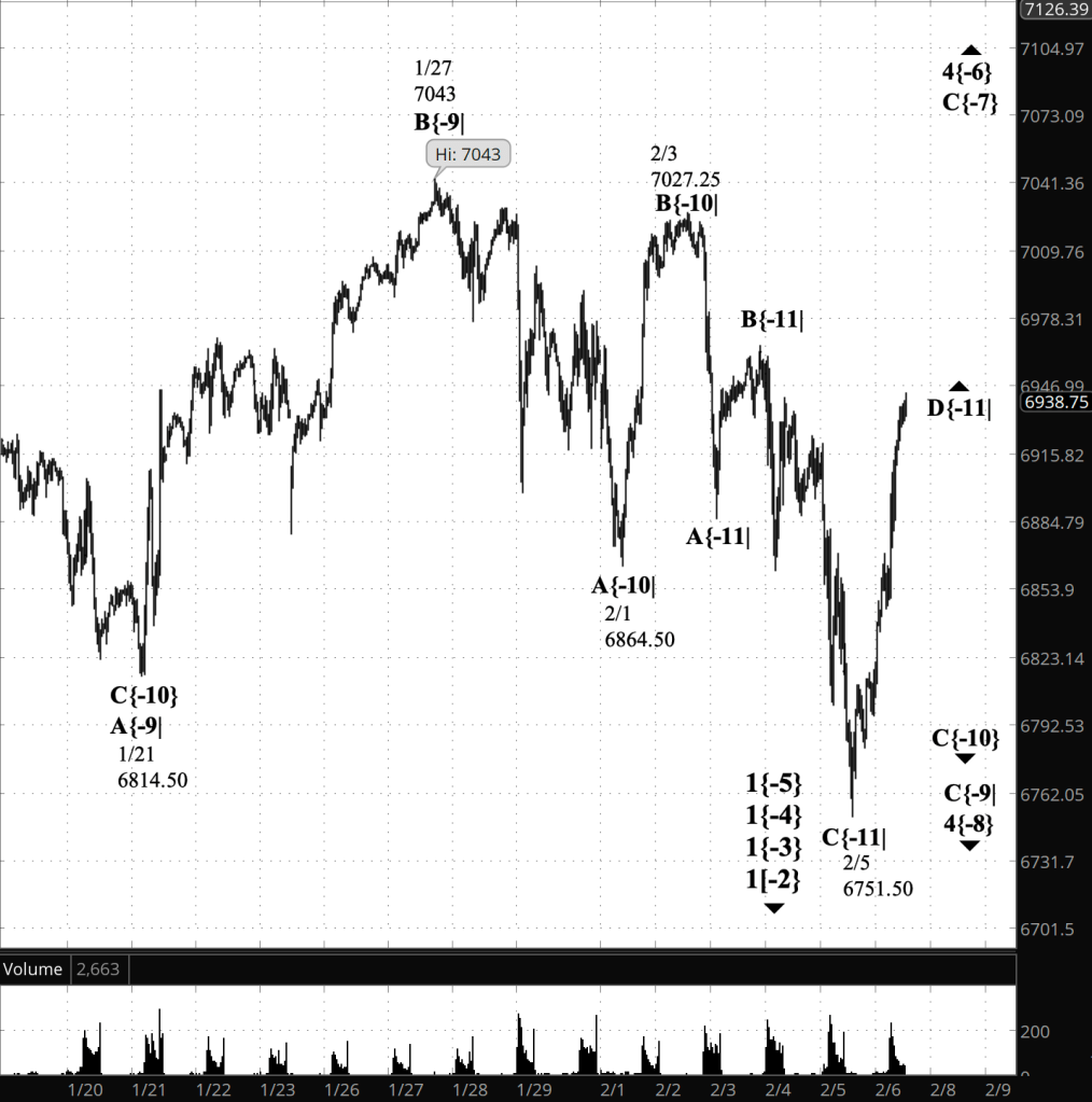 Elliott Wave Theory: Rising wave D{-11} within falling wave C{-10} continues. The next upside decision point is 6946.99; acceptance above it would point to a further push toward 6978.31. A rollover that breaks back below 6915.82 would be the first sign that falling wave E{-11} is beginning and that the market is resuming the larger corrective decline.
