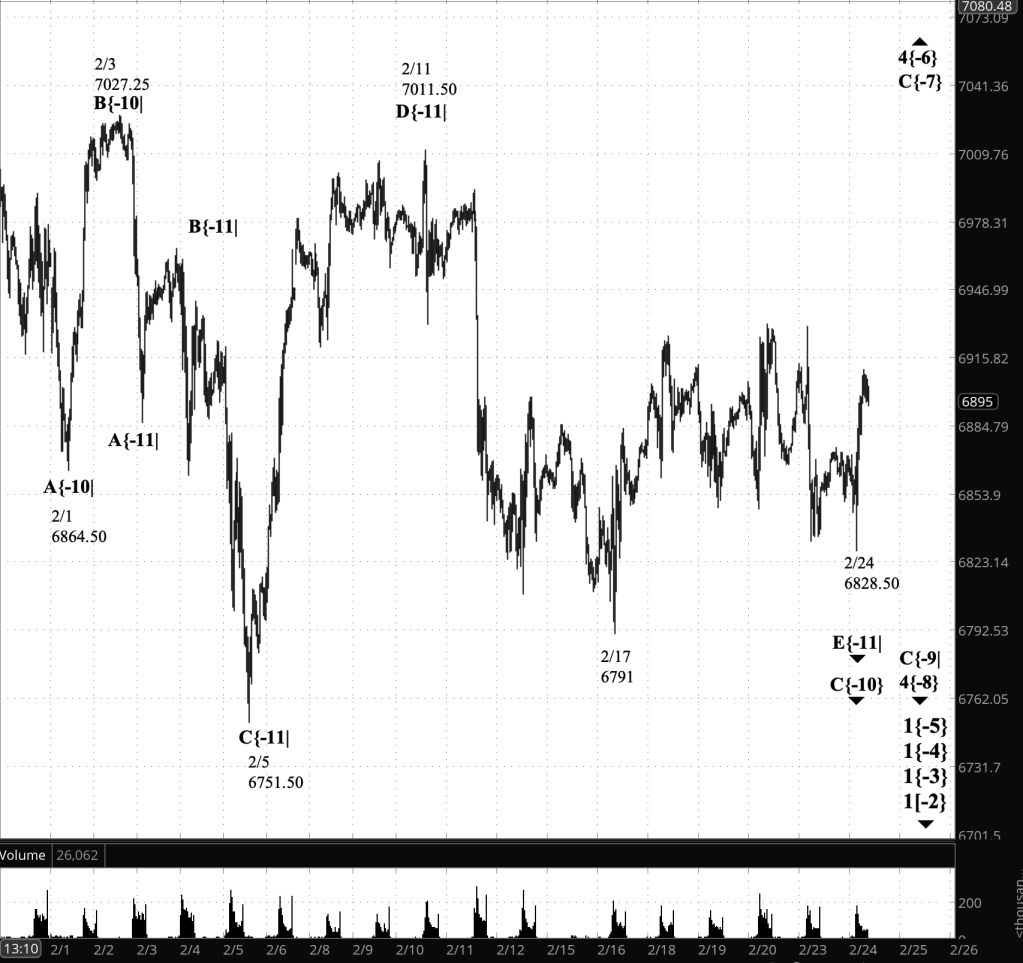 I have placed date and price labels on two possible candidates: February 17 at 6791, and today, February 24, at 6828.50. The earlier date appears to mark the end of a clear five-wave decline. The later date is distinguished by the energy of the subsequent rise, especially when compared with the more halting advance that followed the earlier low.