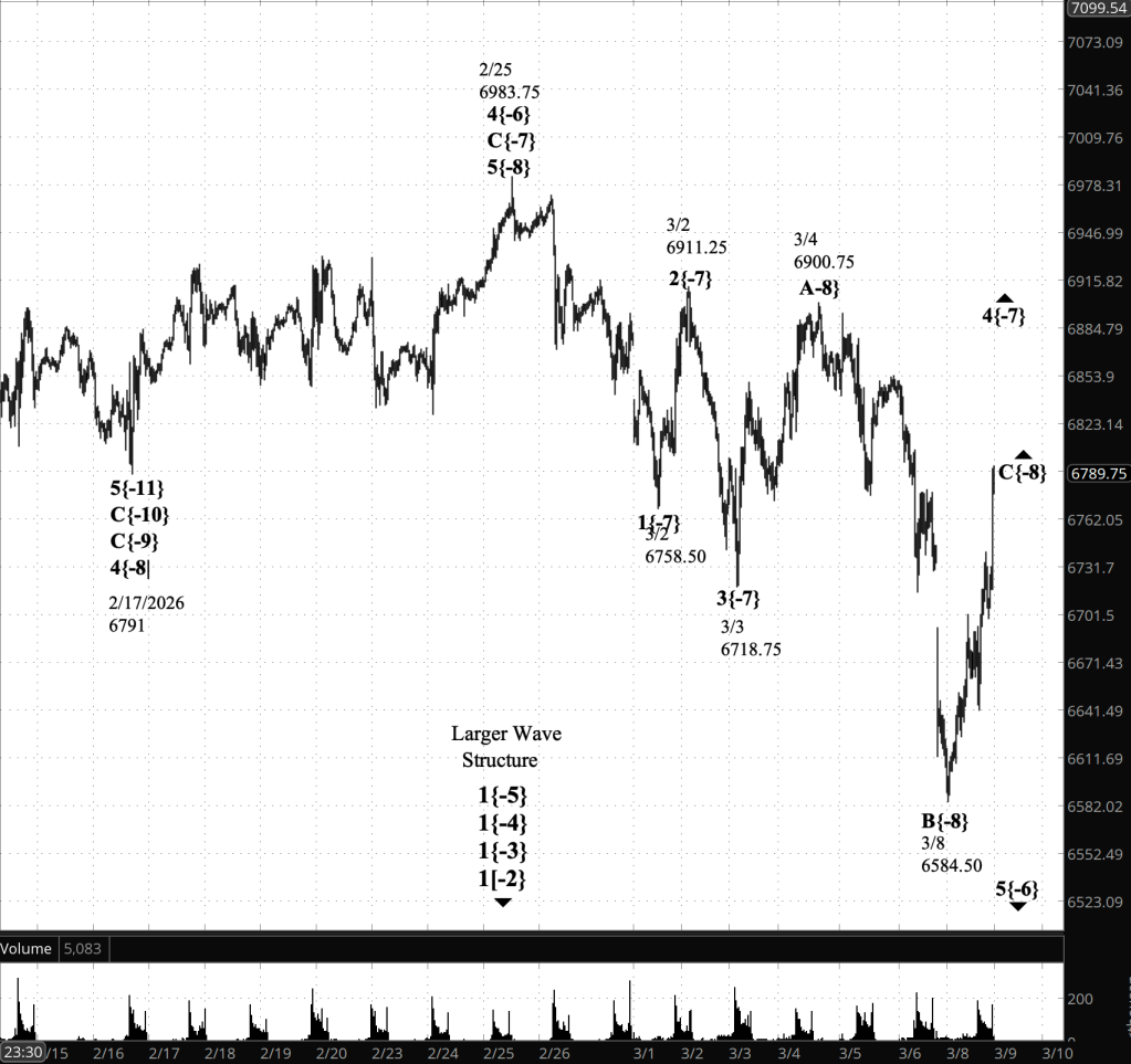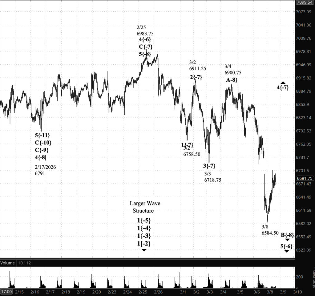 The decline following the Sunday opening gap reached a low of 6584.50 before reversing upward. That level lies just above the 6580 decision point identified in the weekend planning session. Because the market reversed before breaking that threshold, Elliott Wave Theory interprets the decline as falling wave B{-8} within the ongoing wave 4{-7} correction.