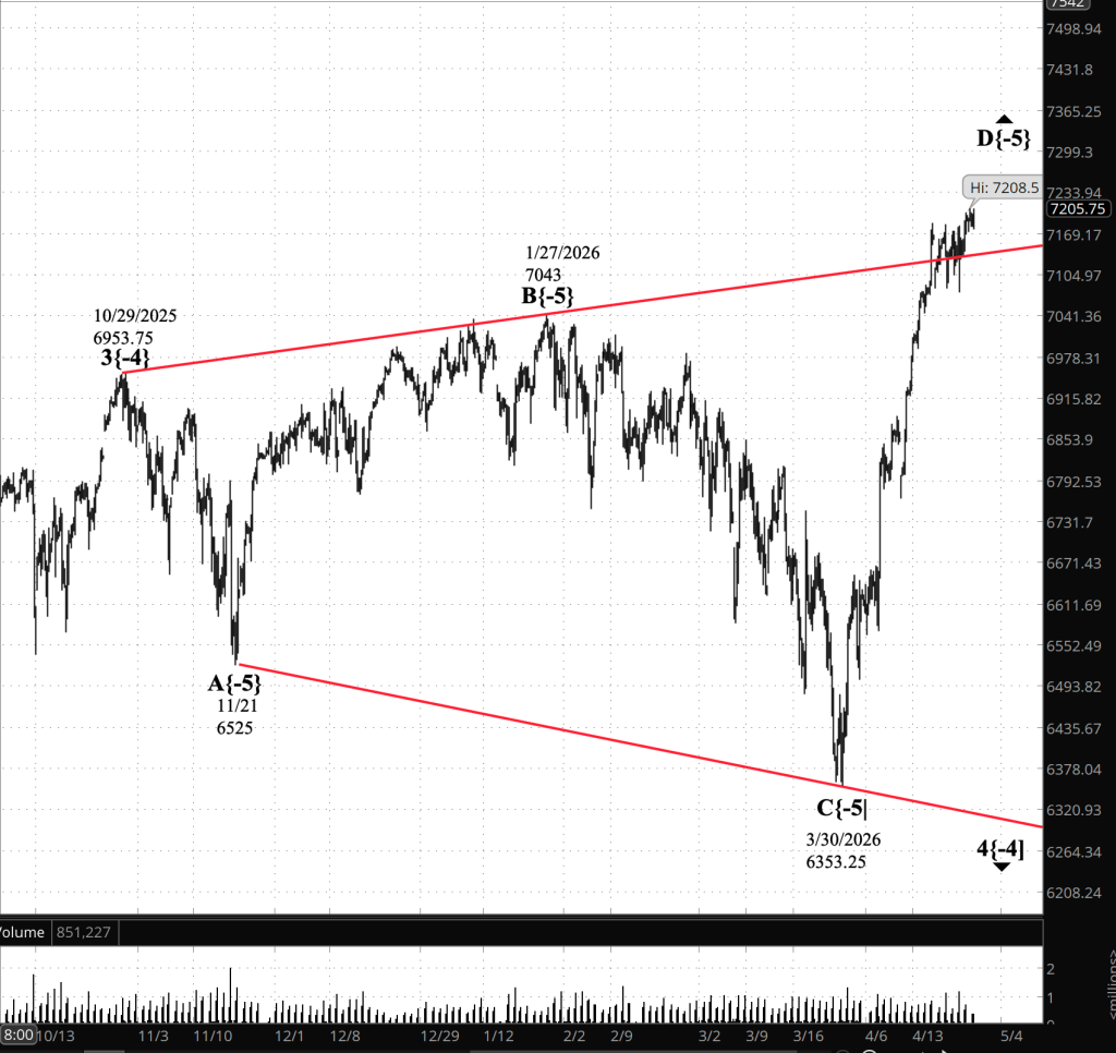 What does it mean? In terms of Elliott Wave Theory, the futures are stuck on a line connecting the two completed peaks of an Expanding Diagonal Triangle that began on October 29, 2025 and is now nearing the end of its 4th subwave, rising wave D{-5}. The triangle itself is wave 4{-4}, a downward correction one degree larger than the D wave.