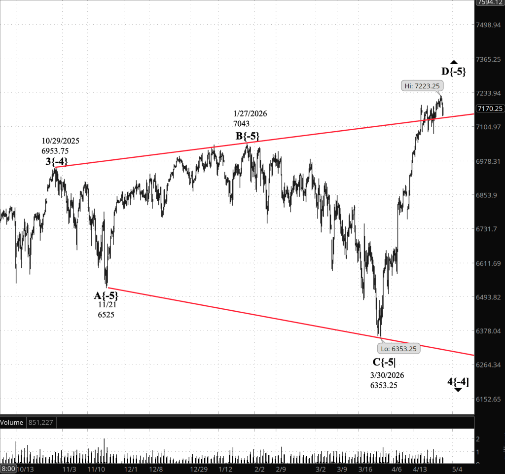 Decision Points. A move above 7208.50 would extend wave D{-5} and keep upward pressure in place. Continued trade in the 7180s and 7190s would leave the market in a waiting pattern, still above the triangle boundary but not yet breaking decisively free. A decline back below the upper boundary, now roughly in the upper 7160s to low 7170s, would be the first sign that D{-5} may have ended and that declining wave E{-5} may be beginning.
