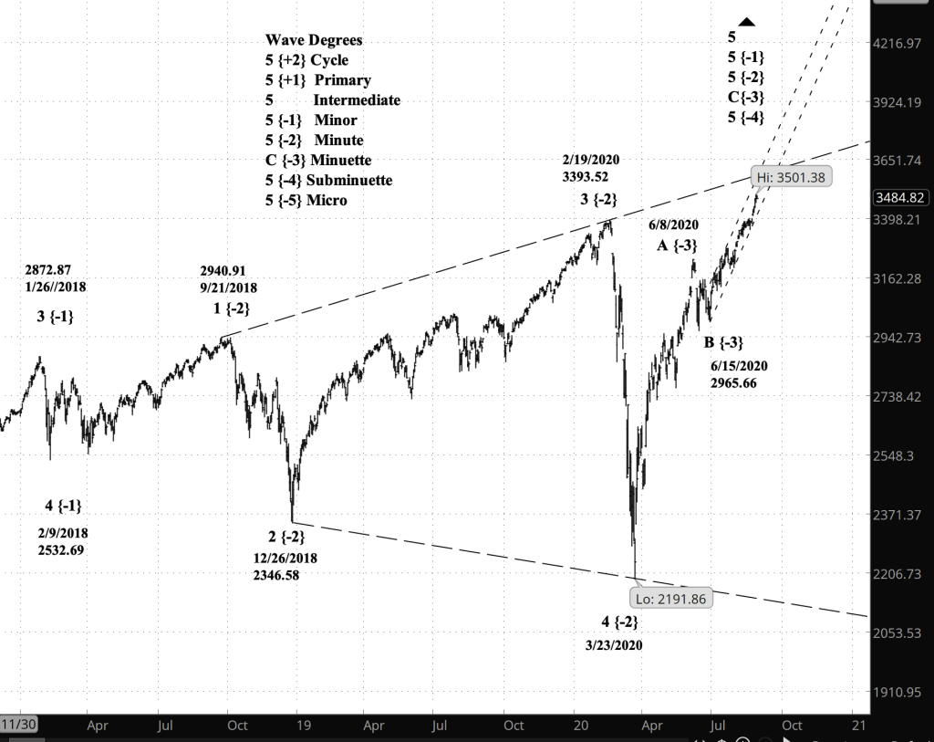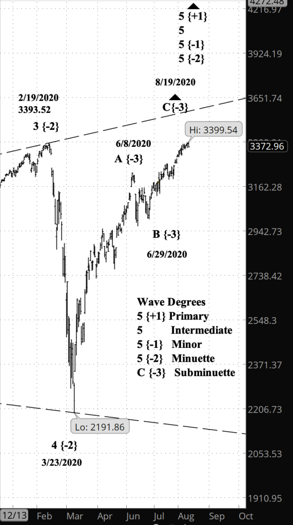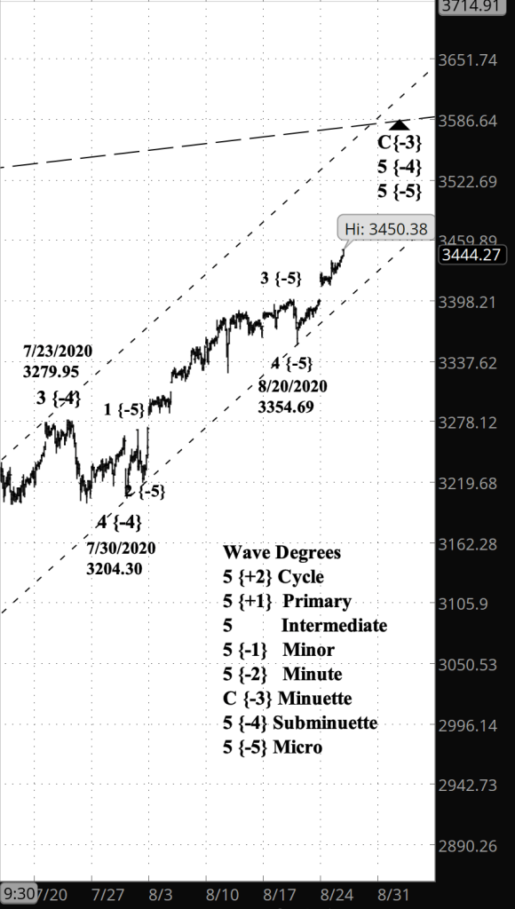 What does Elliott wave theory say? Thursday’s low begins the uptrending wave 2 of Subminuette degree within downtrending wave 3 of Minuette degree. At the Subminuette 2 will end below 3,428.92, the starting point of Minuette 3 and within it, Subminuette 1. A firm rule of Elliott wave analysis posits that a 2nd wave cannot move beyond the start of the preceding 1st wave. Subminuette 2 will be followed by Subminuette 3, which will take the price down to new lows in the decline since September 16