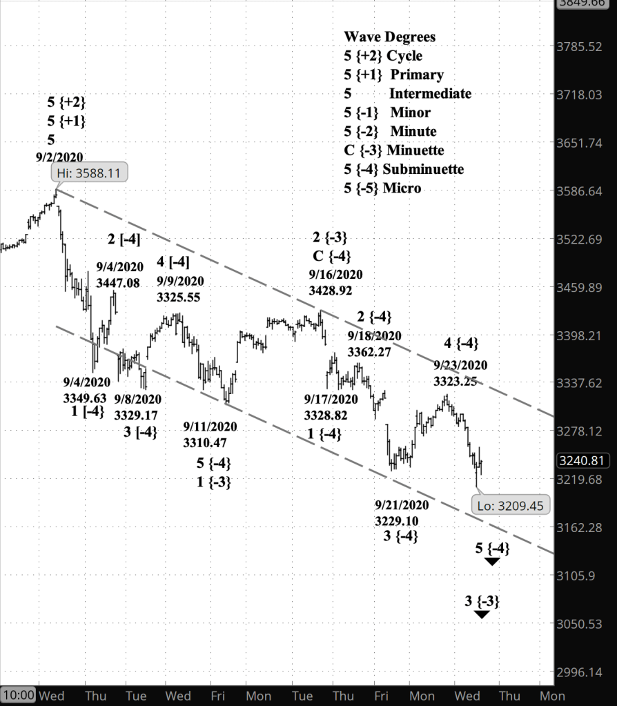 The end of Subminuette 5 also ends Minuette wave 3, which began its downward course on September 16 at 3428.92. What follows will be a corrective wave, wave 4 of Minuette degree. A 4th wave is always a different pattern than the preceding 2nd wave. Minuette wave 2 was a Zigzag, so wave 4 will be a Flat, a Triangle or a Flat Combination.