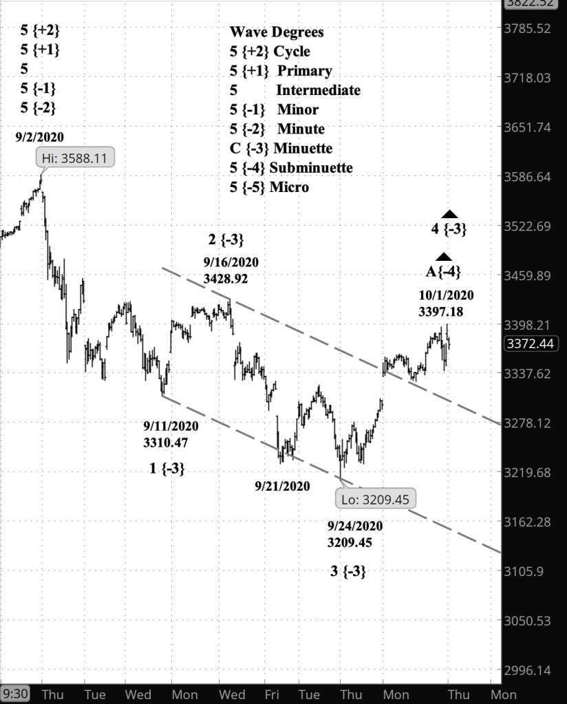 What’s happening now? The S&P 500 index moved a bit higher in overnight trading, to a high so far today of 3397.18. The upward correction that began September 24 has so far covered 187.73 points, or 5.8%.