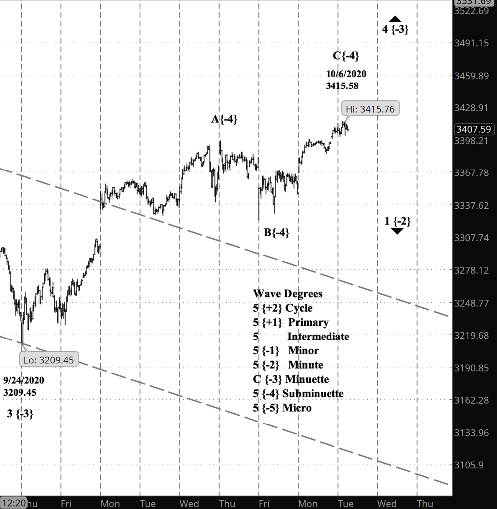 In any case, once Minuette wave 4 is complete, what follows is Minuette wave 5, whose downward course could reach the lower boundary of the price channel, presently around 3113. The end of Minuette 5 also marks the end of Minute wave 1 to the downside, which began on September 2.
