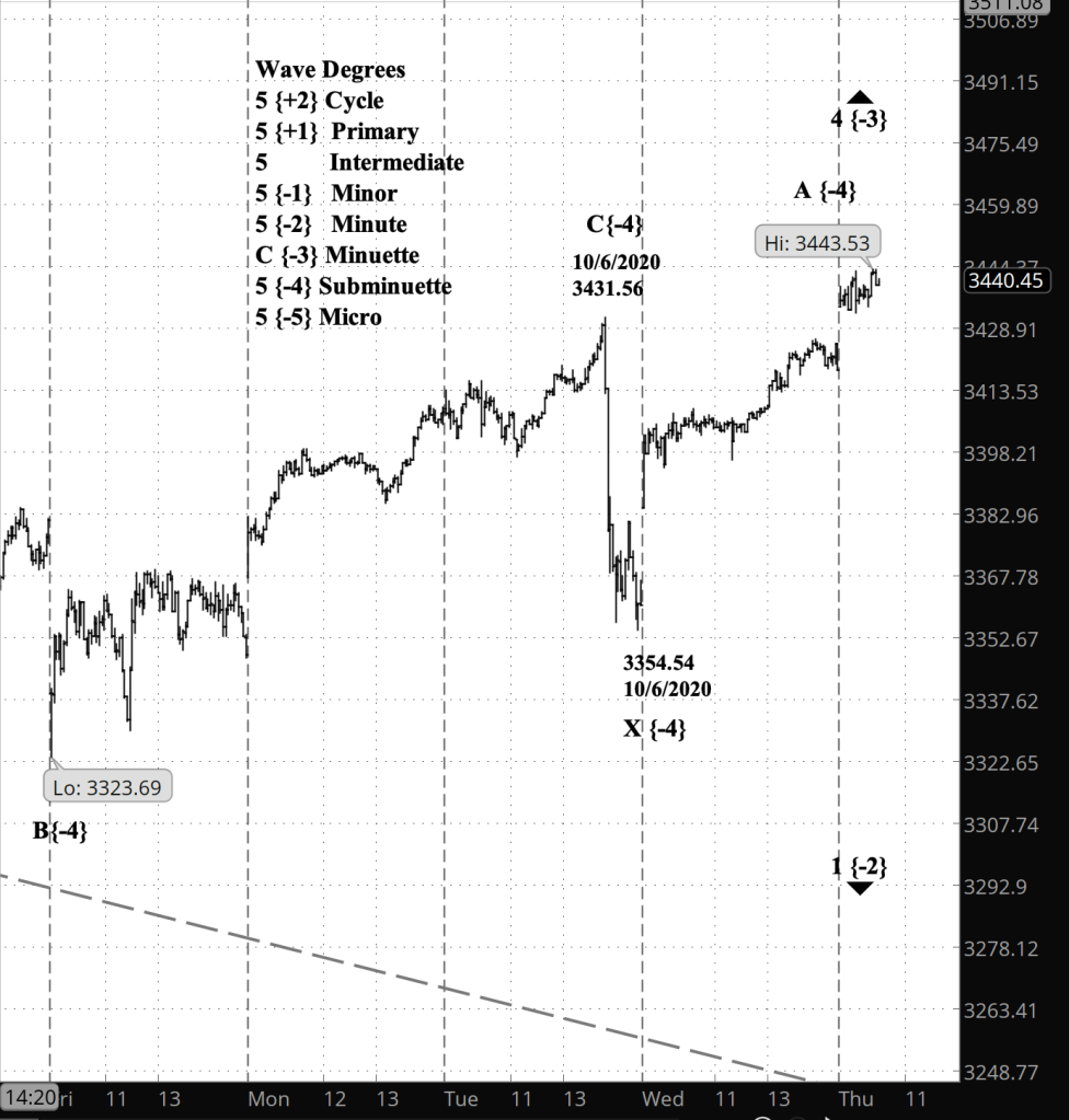 What does Elliott wave theory say? Under what is now my principle analysis, the high yesterday marks the end of Subminuette wave C within Minuette wave 4, which in turn is a subwave of Minute wave 1, the first part of the dominant downward trend. The subsequent decline is Subminuette wave X, a separator, as Minuette wave 4 continues with Subminuette wave A of the second part of a compound correction.