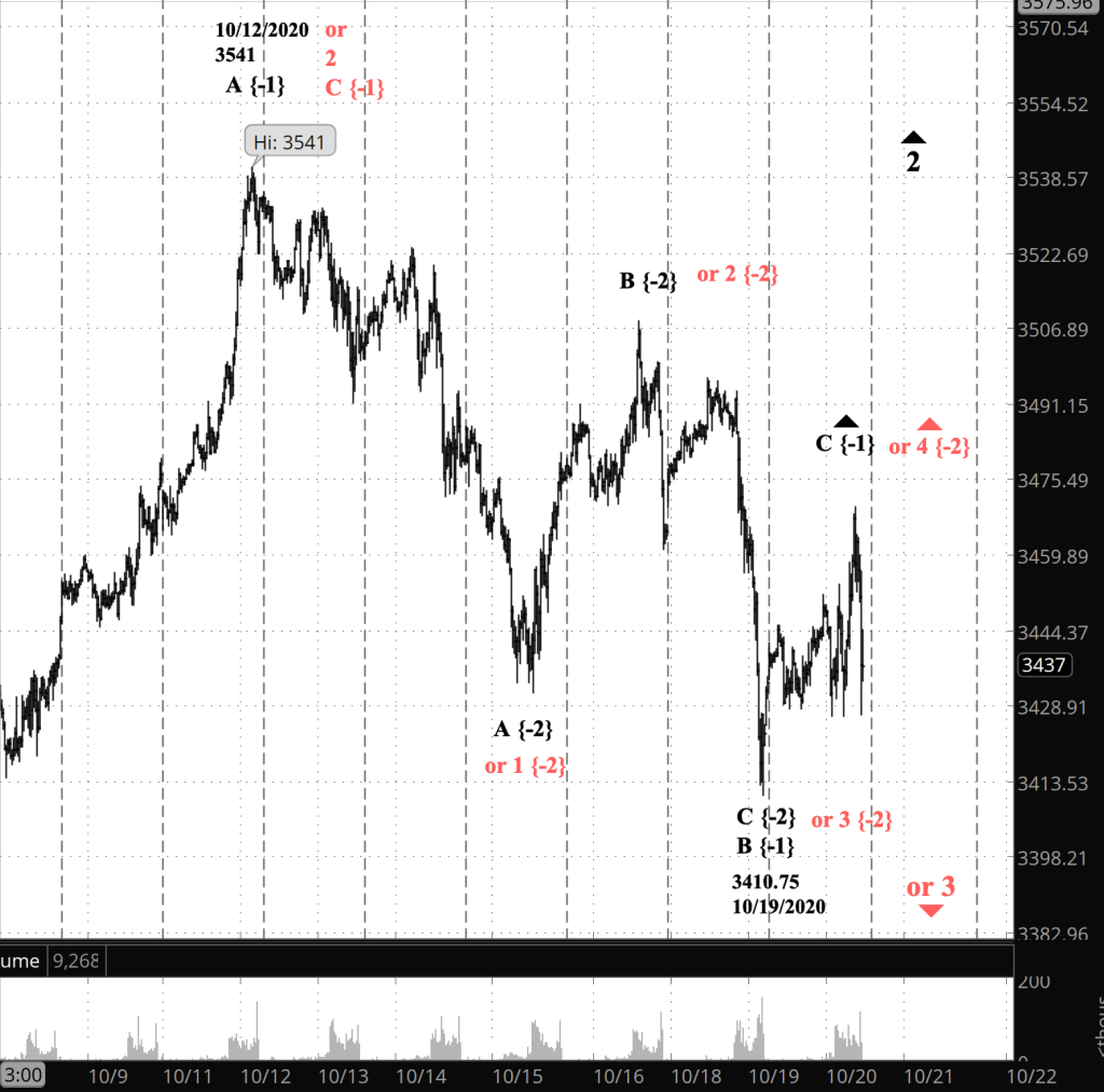 The Chart. On the chart below I’ve labeled the principle count in black and the first alternative count in red. I’ve used the S&P 500 E-mini futures, which never stop trading except on weekends, in order to have a more complete picture of the relative small movements we’re examining.