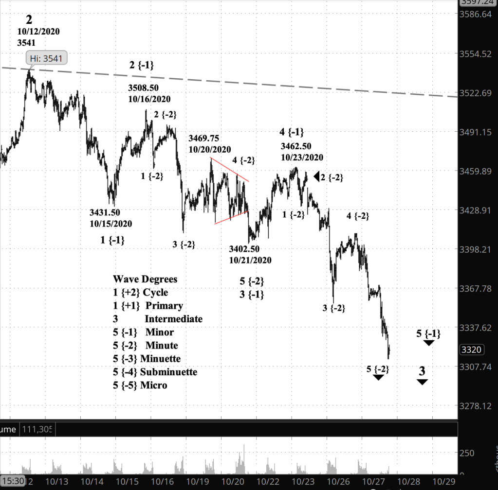 What does it mean? The fall is the final movement that began on October 23, from 3462.50, and its parent decline that began on October 12, from 3541. It’s completion will usher in a significant upward correction that will mostly be a Flat pattern that will reach somewhere in the range of 3402 (the October 21 low) to 3460 (the October 23 high on the index, or 3402 to 3462 on the E-mini futures on the same dates.