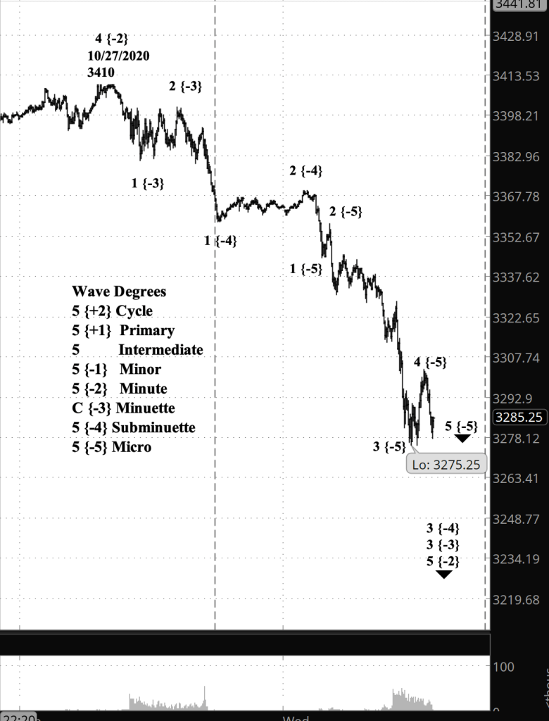 Here is a chart analyzing wave 5 of Minute degree, a downward movement that will complete the larger wave 5 of Minor degree and the still larger wave 3 of Intermediate degree. The completion of the present wave 5 of Micro degree will complete its parent, wave 3 of Subminuette degree, which will be followed by an upward Subminuette 4 movement that under the Elliott wave rules is likely to stay bellow 3308 on the futures chart.