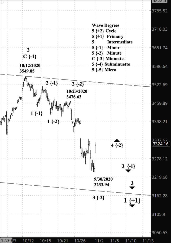 The Minute degree correction is a subwave of wave 3 of Minor degree, which in turn is a subwave of wave 3 of Intermediate degree. All of this is tracing the middle ground of wave 1 of Primary degree, which began on September 2.