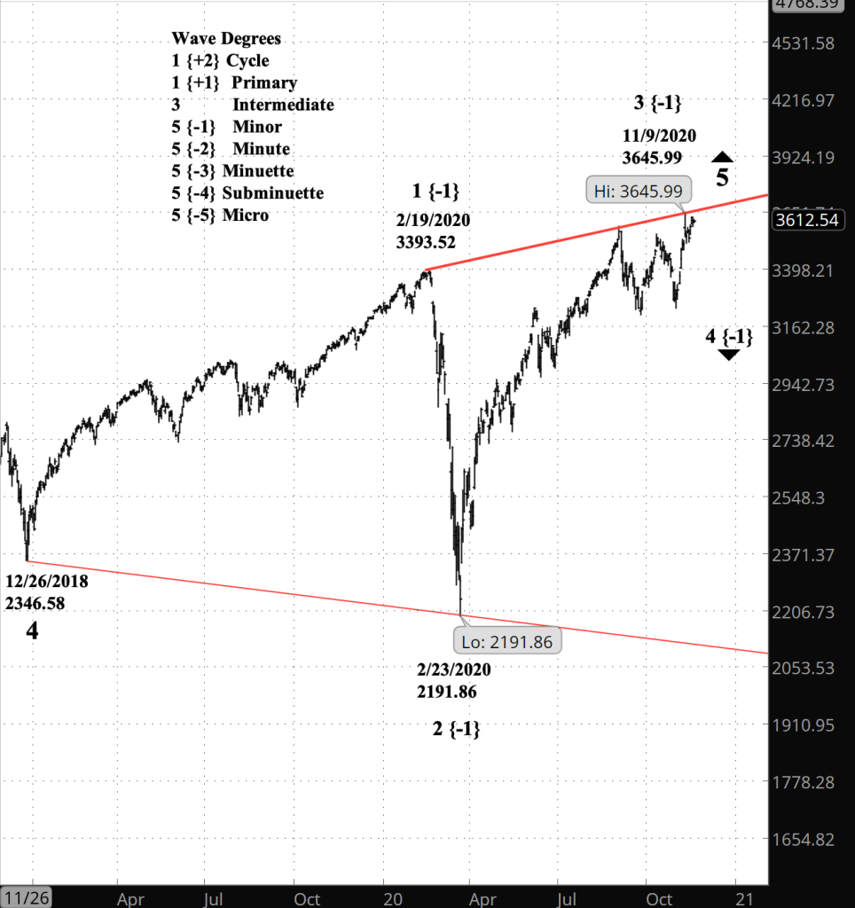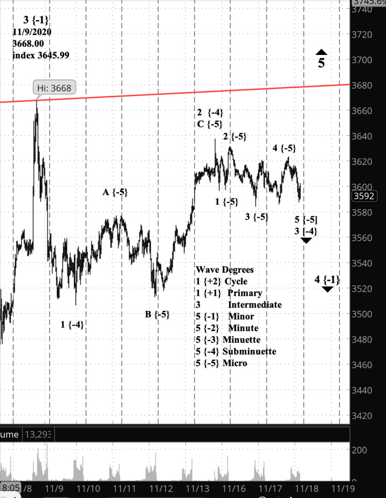 At a smaller level, Minor wave 4 — a subwave Intermediate 5 — is underway, beginning on November 9, when Minor wave 3 reached completion.