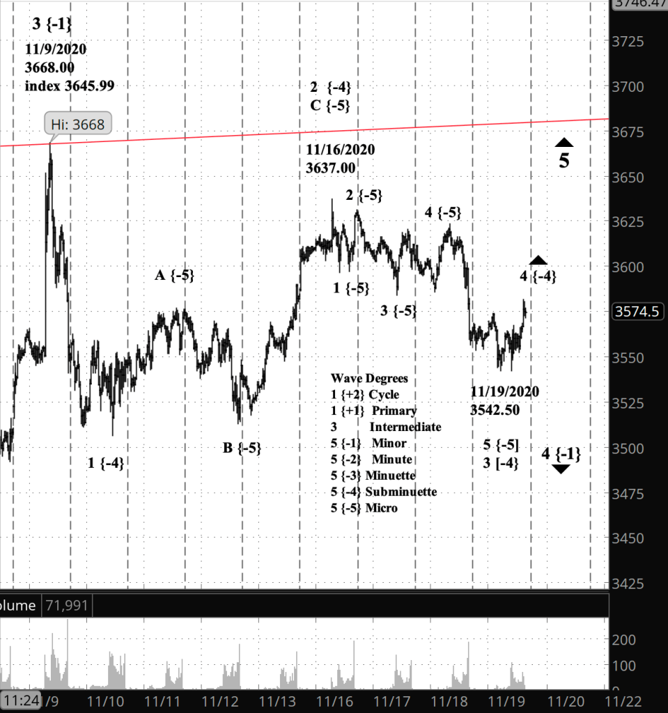 What does Elliott wave theory say? These are all small-scale movements within Minor wave 4, a downward movement that began with the 3rd wave peak on November 9, at 3645.99 on index, 3668 on the futures. The overnight decline was wave 5 of Micro degree, and it completed wave 3 of Subminuette degree, which began on November 16 at 3637 on the futures.