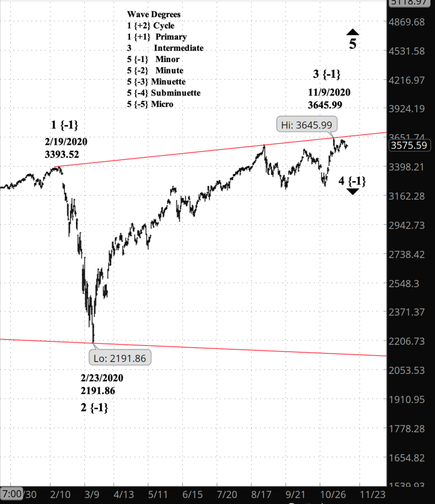 What does Elliott wave theory say? The present decline is Minor wave 4, a subwave of Intermediate wave 5 within 5th waves of Primary and Cycle degree. This chart, going back to the beginning of 2020, shows how small a movement there has been so far. Early days.