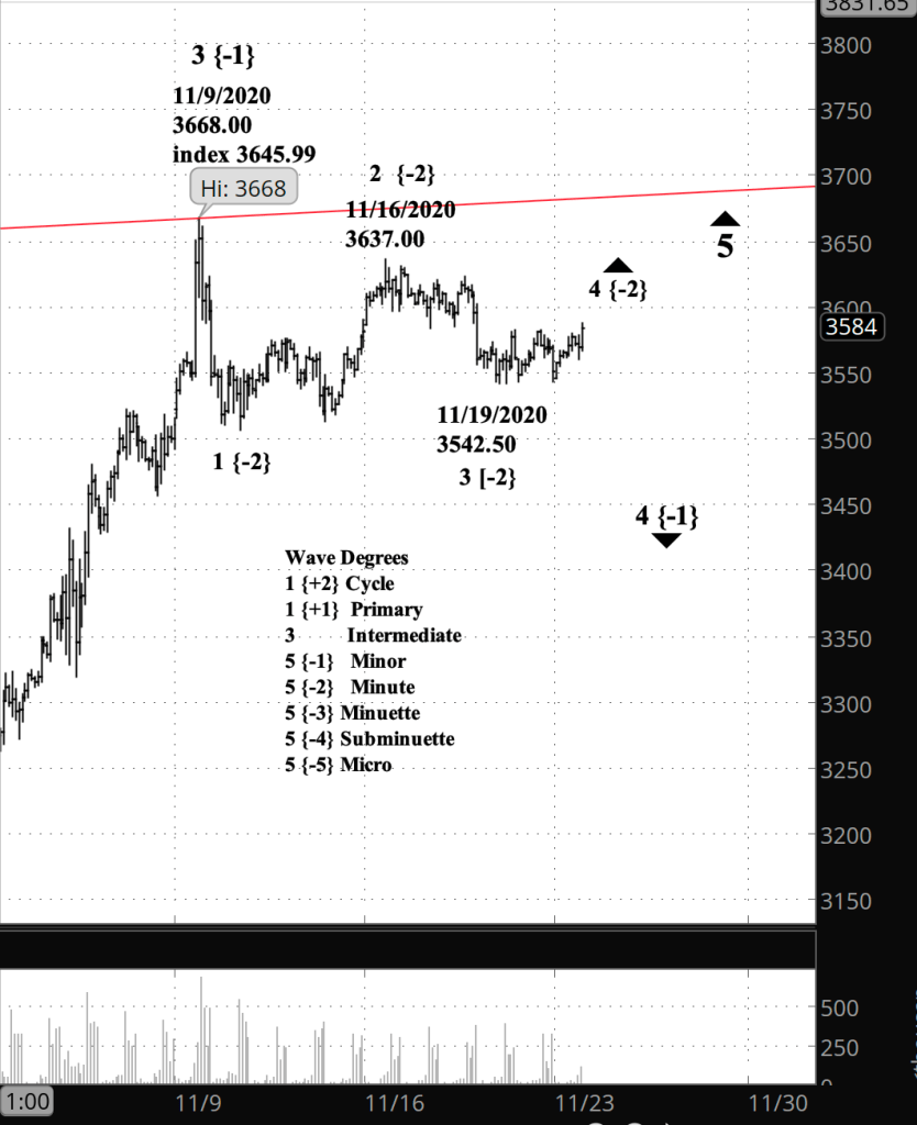 About the chart. I’ve moved the subwaves of the correction up a couple of degrees, so that what had been labelled the Subminuette degree {-4} is now labeled the Minute degree {-2}. The ambiguities are still in place, but as the parent wave plays out, the new labeling seems increasingly more likely. If events lower the likelihood, then I’ll change the degree structure in my analysis.