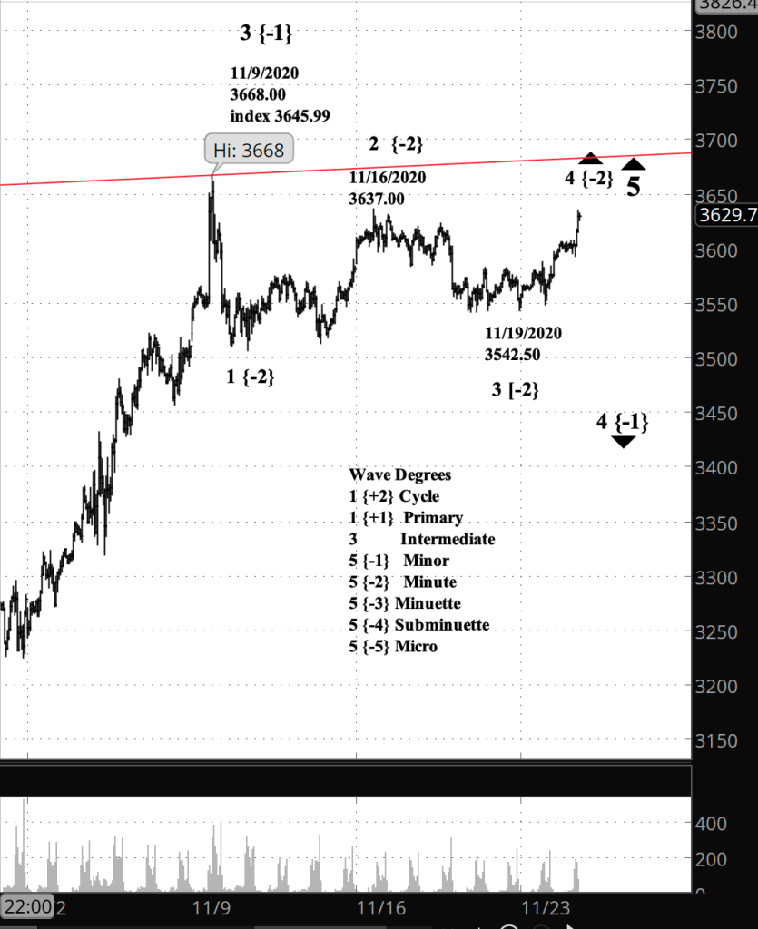 Although the Dow Jones Industrial average moved above its high of November 9, the end of Minor wave 3 to the upside, neither the S&P 500 nor the index-based E-mini futures have exceeded that level. I’ve updated the E-mini futures chart below.