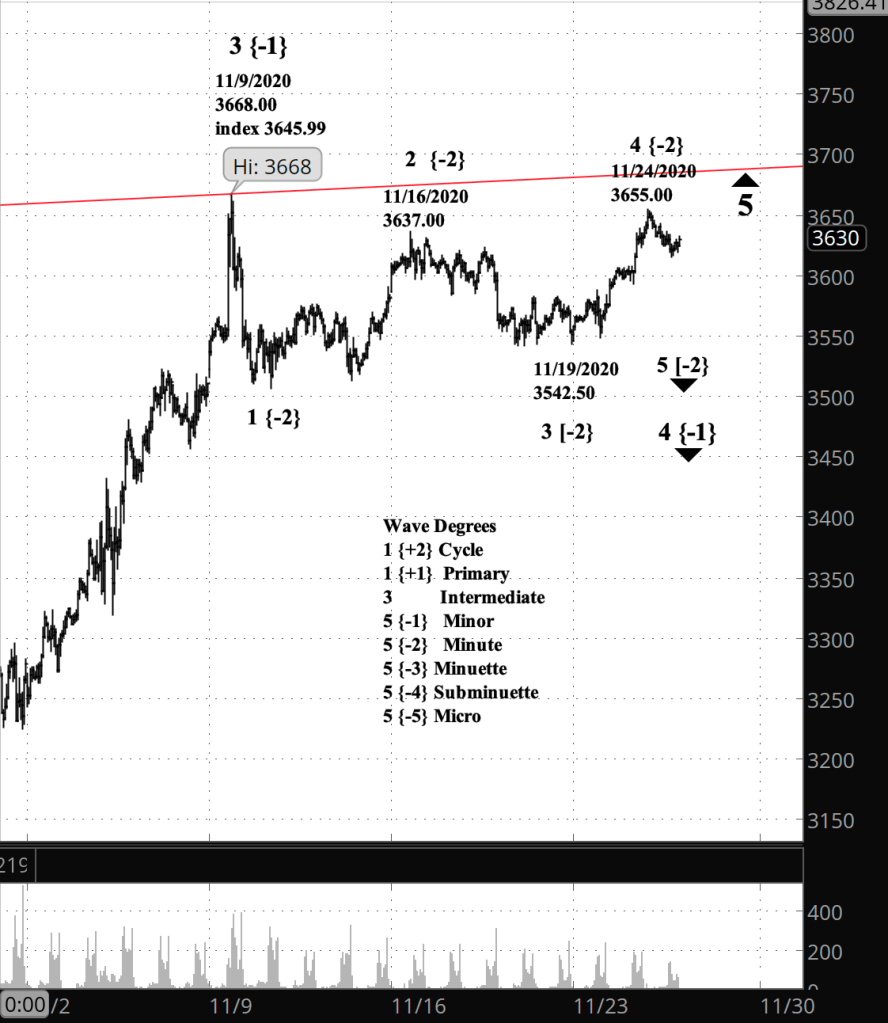 What does Elliott wave theory say? Minute wave 4 ended on Tuesday at 3655 on the futures — 3642.31 on the index — and began to decline as Minute wave 5. The end of Minute 5 will also mark the end of Minor wave 4, a downward correction that began November 9 from 3668 on the futures, or 3645.99 on the index. Minor 4 is the penultimate subwave of Intermediate wave 5 to the upside.