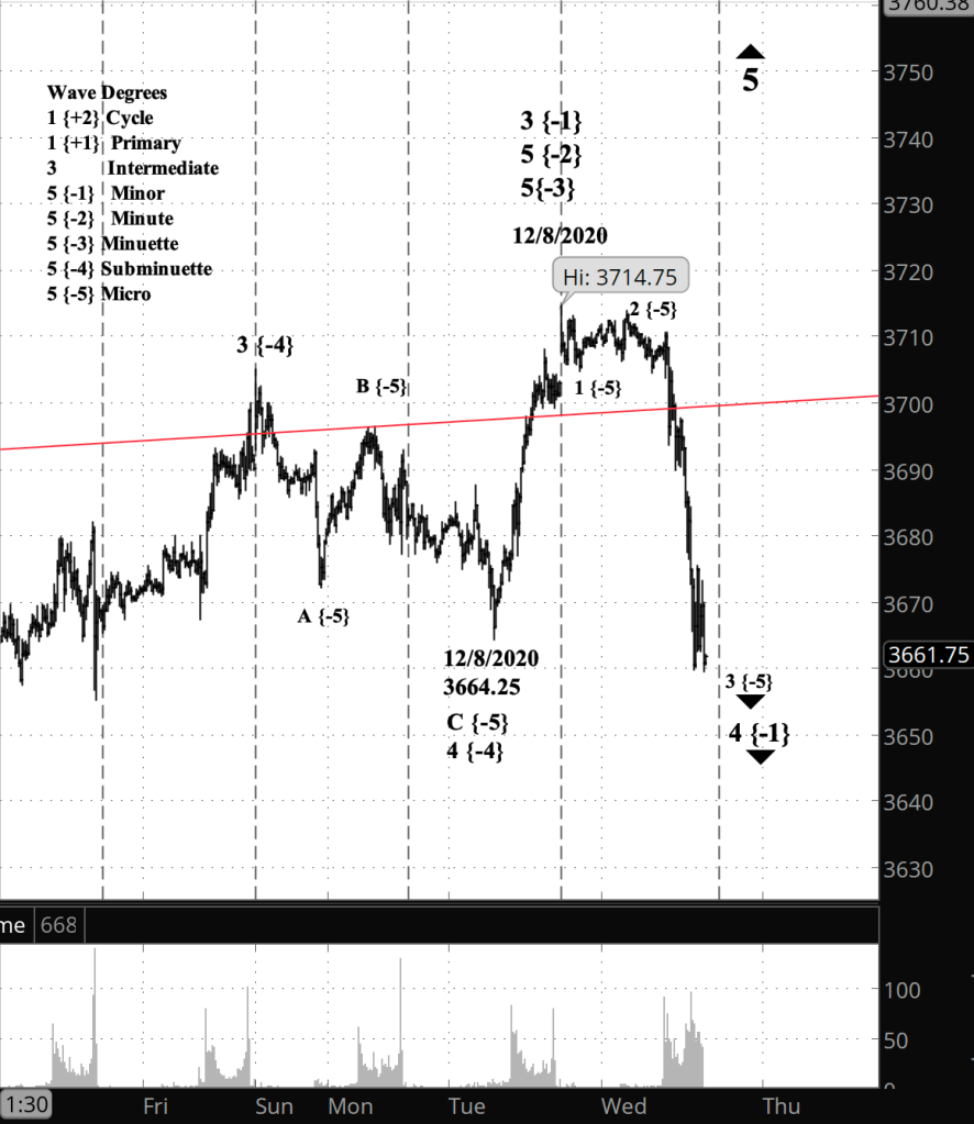 What does Elliott wave theory say? The rise from Tuesday’s low (3664.25) has so far traced five waves, with a bit of ambiguity regarding the first wave. I count that rise as wave 5 of Subminuette degree, leading to a wave 5 completion up to the parent Minute degree, and a wave 3 completion one degree up from there, at the Minor degree.
