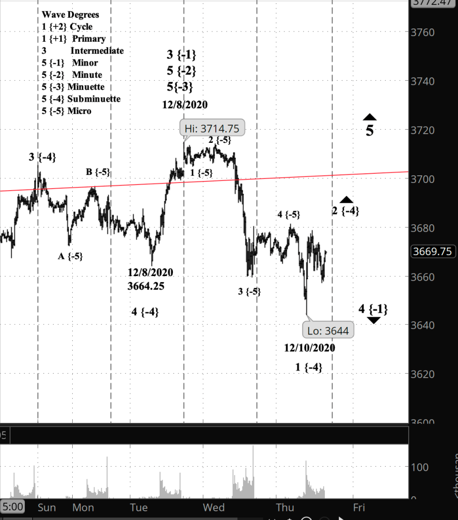 What does it mean? The first small movement to the downside is in its final stage and will be followed by an upward correction that could take back much of the decline from the high of 3714.75 reached on December 8. Although there’s no requirement that it be that steep; a shallow correction is perfectly within the rules of Elliott wave analysis.
