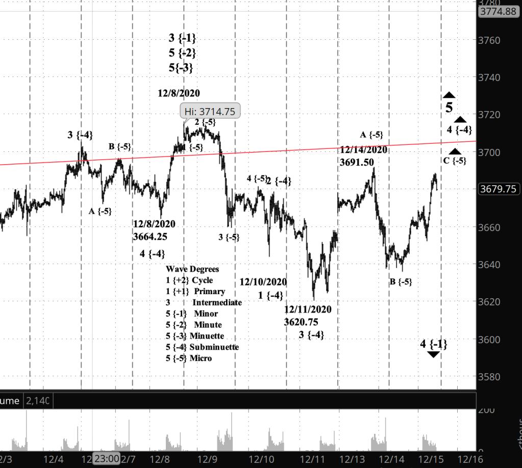 What does Elliott wave theory say? Wave A of Micro degree began its rise December 11 and ended on December 14, beginning the declining wave B, which ended last night around midnight. The present rise is Micro wave C. All of this is happening within wave 4 of Subminuette degree within wave 5 of Minuette degree.