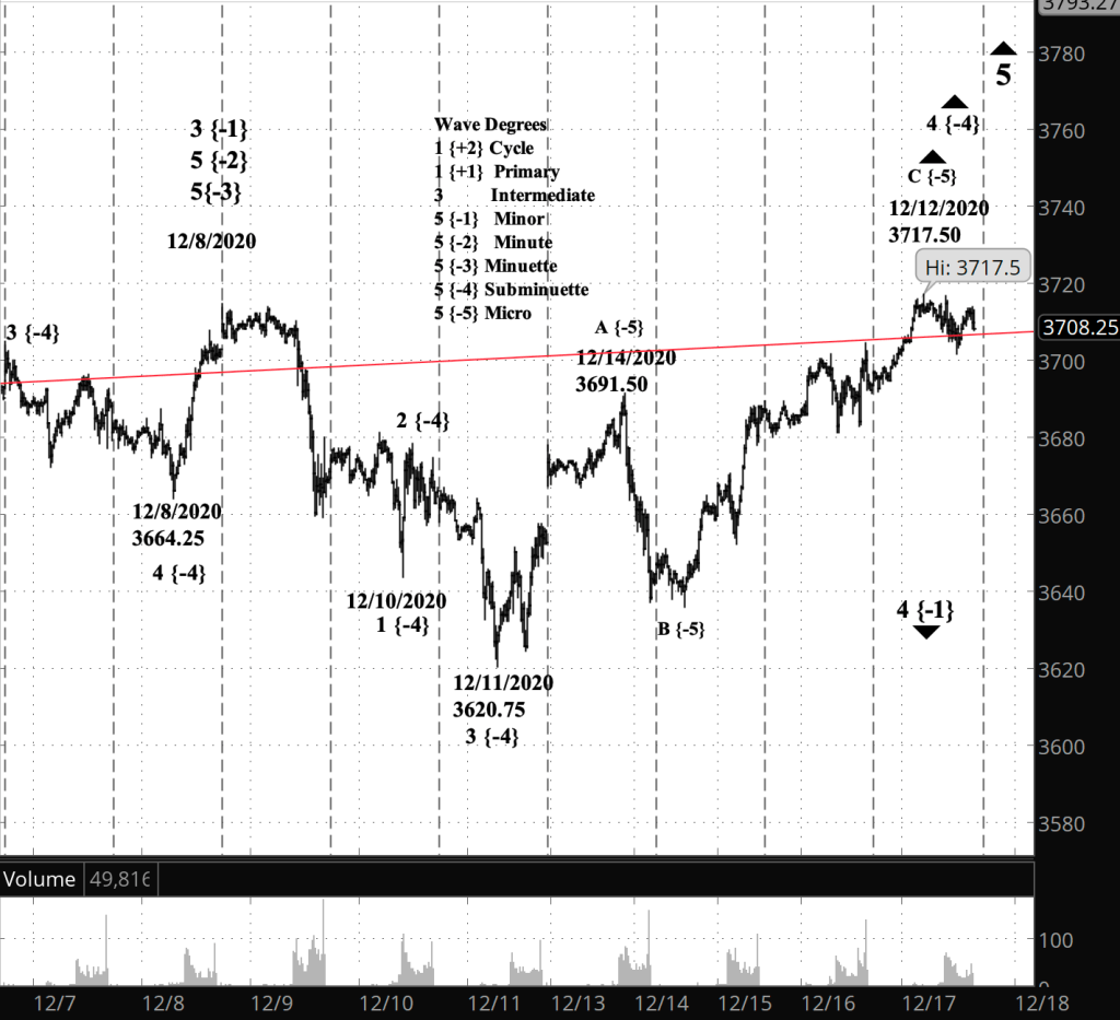 Half an hour before the closing bell. The S&P 500 futures continue to trade above the upper boundary of the Diagonal Triangle that began in December 2018 and that continues to define, roughly, the upper boundary of the present rise, the 5th wave of Intermediate degree. In today’s trading the price briefly dropped below the boundary but quickly bounced back, while remaining below the high, 3717.50 (3725.12 on the index), that may mark the peak of the upward correction, wave 4 of Subminuette degree. I’ve updated the chart below.