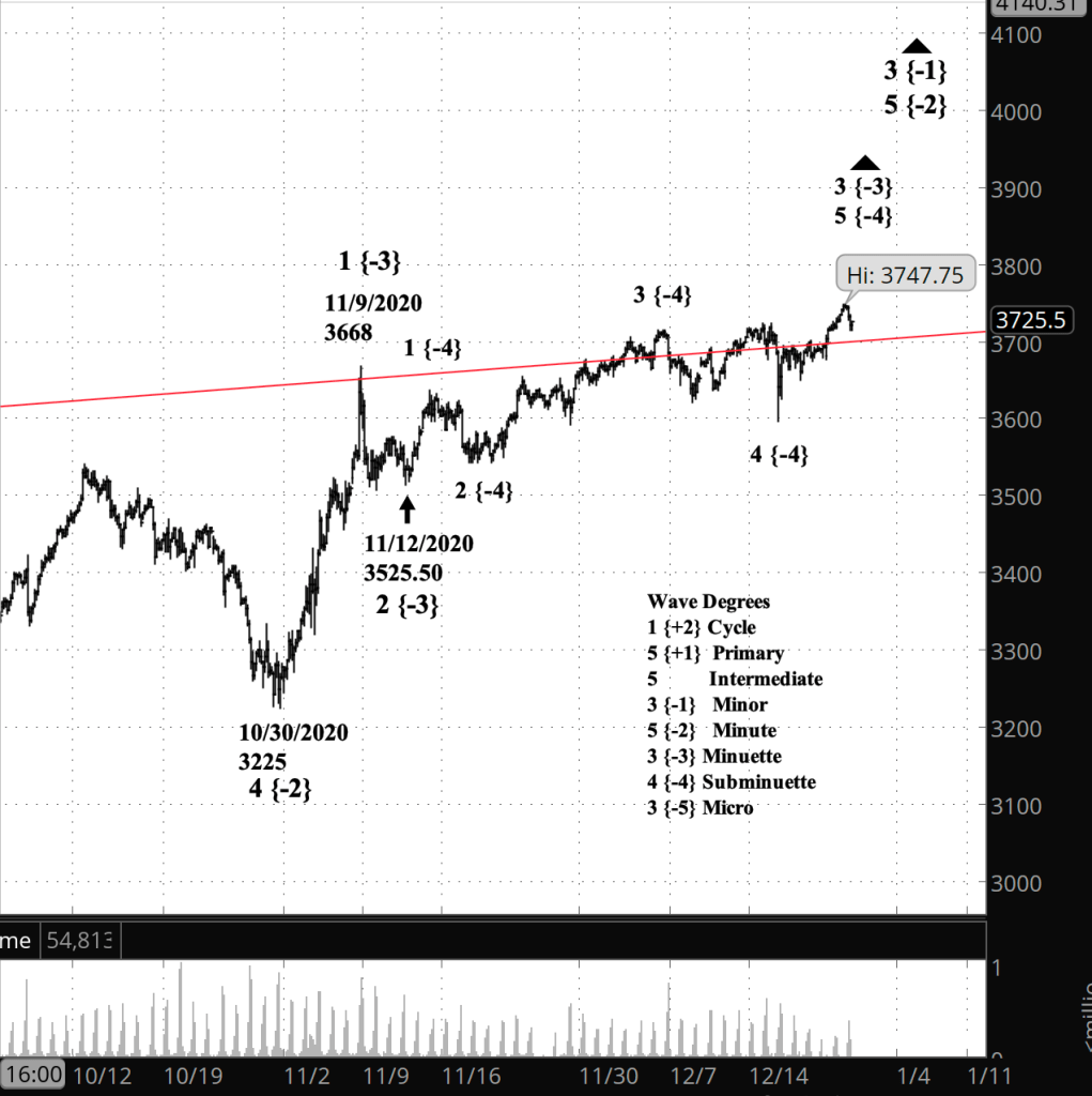 Half an hour before the closing bell. The overnight high of 3747.35 on the S&P 500 E-mini futures was unequalled during the trading session. The price dropped during the day by 20 points plus a little. A quick look at the rise today appears to be a 3rd wave of Micro degree within a 5th wave of Subminuette degree. Here’s a near-term chart of the futures.