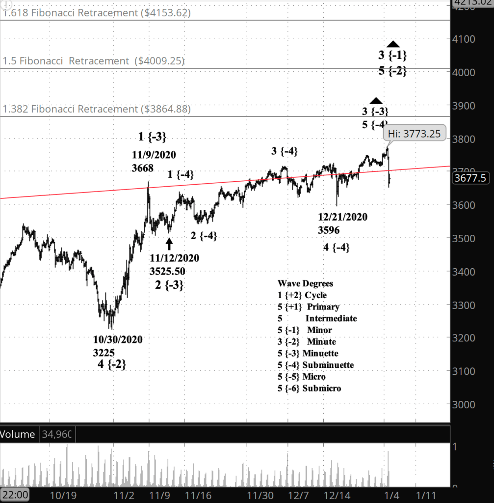 Half an hour before the closing bell. The S&P 500 and derivatives reversed from its peak and dropped 20 points. The E-mini futures peaked at 3773.53 early in the day and then fell to a daily low, so far, of 3652.50. The chart includes the Minor-degree Fibonacci retracement levels for the futures; the Fib’s use in setting targets was discussed below as it applies to the index.