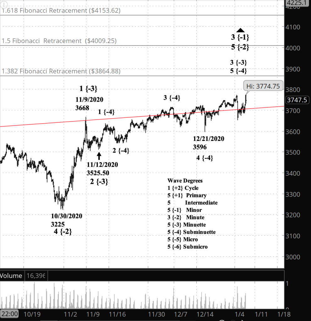What is the alternative? I won’t be entirely confident that the January 4 peak, 3773.25 on the futures, is in fact end of the rise since October 30 until I see the price push below the December 21 low, 3596. Also, even if the correction has has begun, it may well turn out to be a shallow one.
