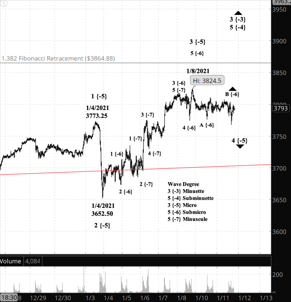 What’s happening now? The S&P 500 E-mini futures continue a shallow correction that began January 8. The price is presently working through the middle wave of the three-wave pattern.
