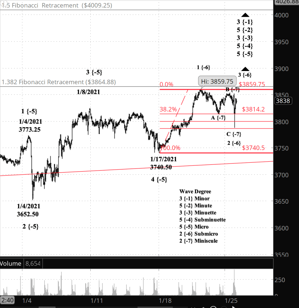 What’s happening now? The S&P 500 E-mini futures rose overnight but remained below the January 21 peak of 3859.75 in the middle wave of a three-wave a correction of the rise since January 17.