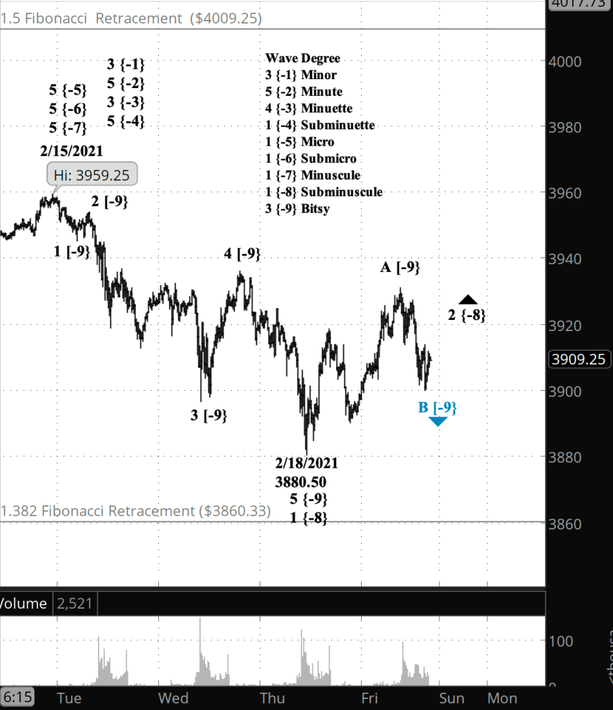 What does Elliott wave theory say? Wave A of Bitsy degree has completed it’s 3rd wave internally and is correcting with wave 4. A final push upward will complete the 5th wave within Bitsy and begin declining Bitsy B, which will remain above the start of A, 3880.50 on the futures. A final wave C of Bitsy degree will push still higher while remaining below the February 15 high and will complete wave 2 of Subminuscule degree. The next move after Subminuscule 2 will be Subminuscule 3, a comparatively powerful wave at this small degree that will push below 3880.50, perhaps by quite a bit.