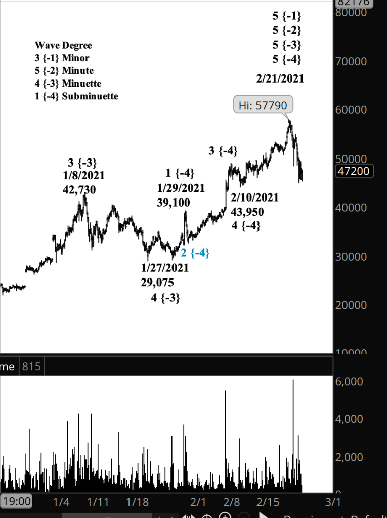 What does Elliott wave theory say? If the price remains above the February 10 level of 43,950, then the rise did not end on February 21 and wave 5 of Subminuette degree is still underway. If the price moves below 43,950, then either the uptrend ended on February 21, or wave 5 of Subminuette degree is taking a Diagonal Triangle formation. If it is expanding, then the price will bounce between widening trend lines for five waves.