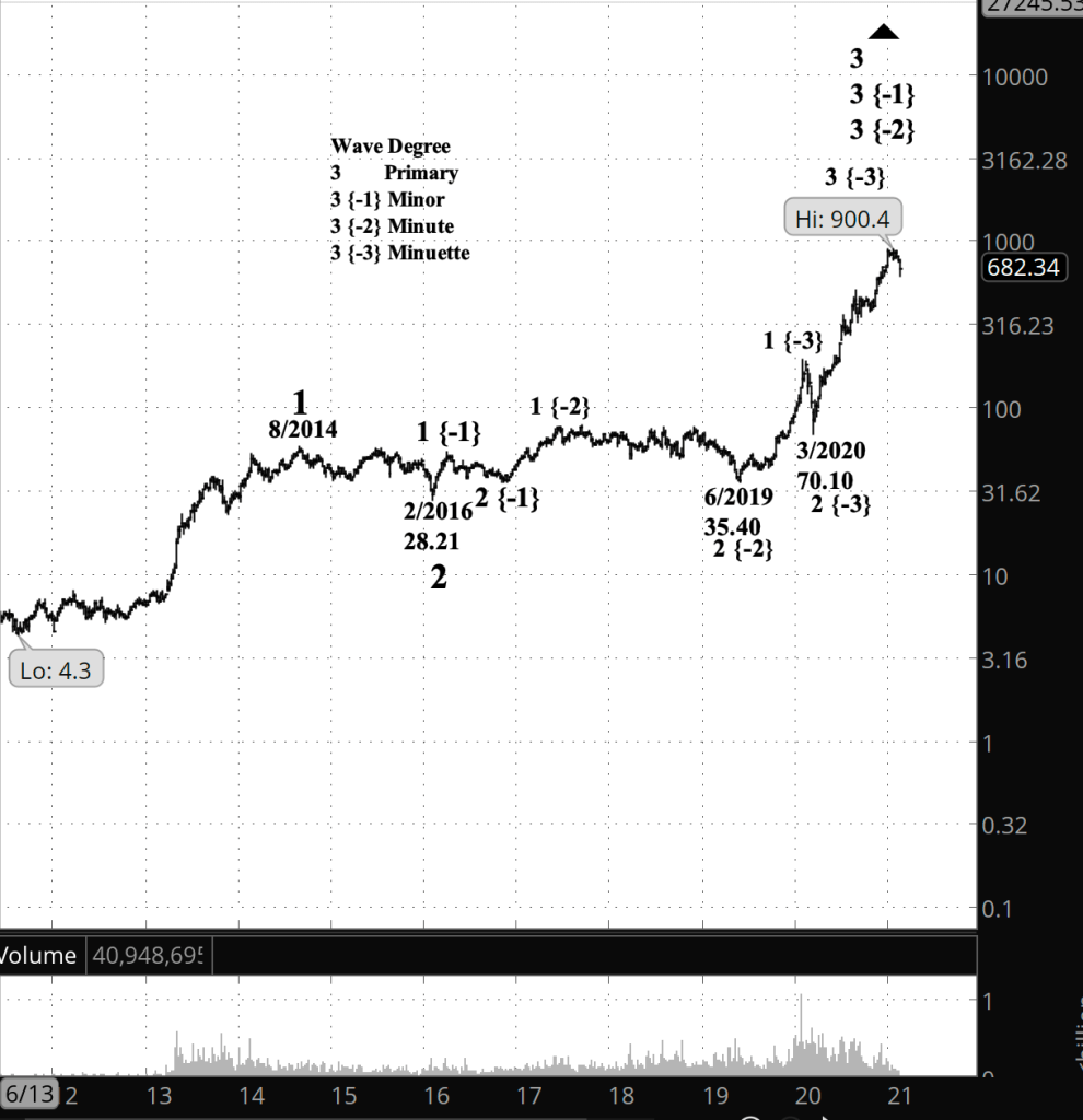 What does Elliott wave theory say? TSLA by my principle count has completed wave 3 of Minuette degree and has embarked on a wave 4 correction to the downside. This is happening within a series of 3rd waves all the way to Primary degree. The whole Primary degree movement is within an uptrending Intermediate degree that began in August 2011 from 4.30.