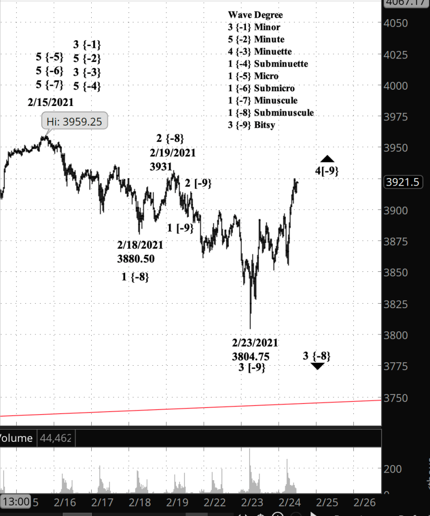 Half an hour before the closing bell. The S&P 500 rose past sharply during the day, reaching a high of 3924.75 on the futures, 3928.39 on the index. I’ve updated the chart below adjusting some of the internal count to avoid wave 3 of Bitsy degree being the shortest wave, which is forbidden under the rules of Elliott wave analysis.
