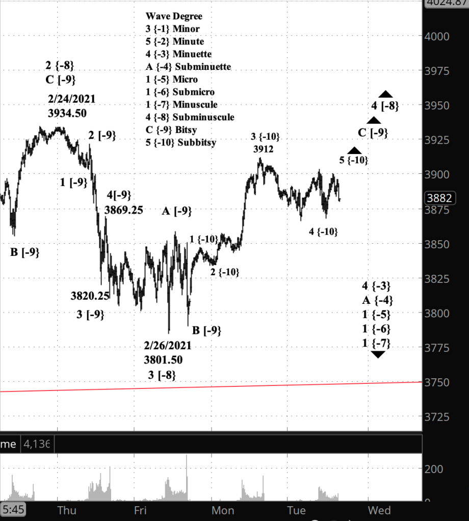 What’s happening now? The S&P 500 E-mini futures continue an upward correction that began on February 26 from 3801.50 and by my analysis are in the last phase of the rise. The high so far today is 3903.50.