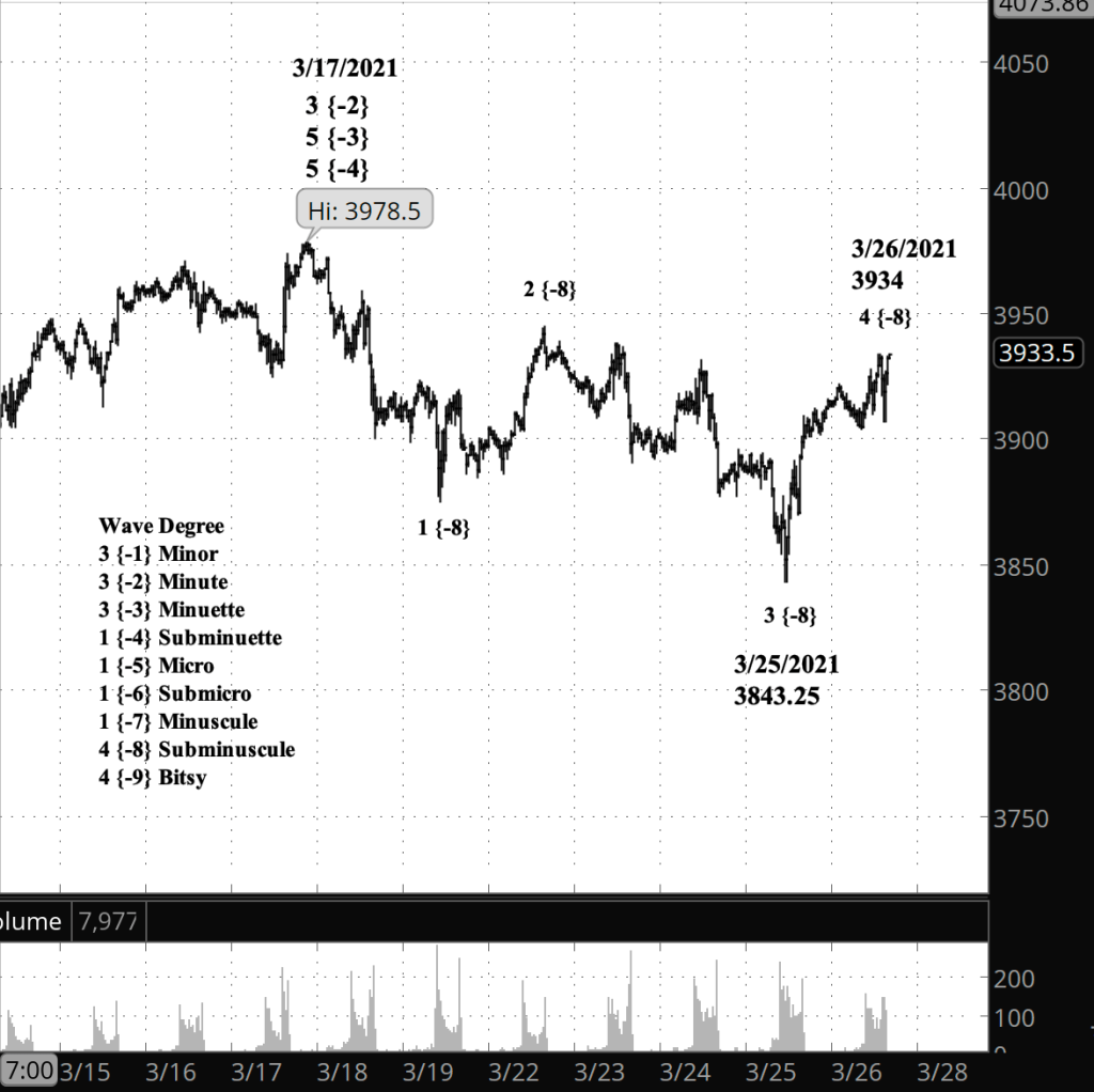 Half an hour before the closing bell. The S&P 500 has risen slightly above the morning high, to 3934 on the E-mini futures, 3919.54 on the index. It is unclear whether that level marks the end of wave 4 of Subminuscule degree. I’ve updated the chart.