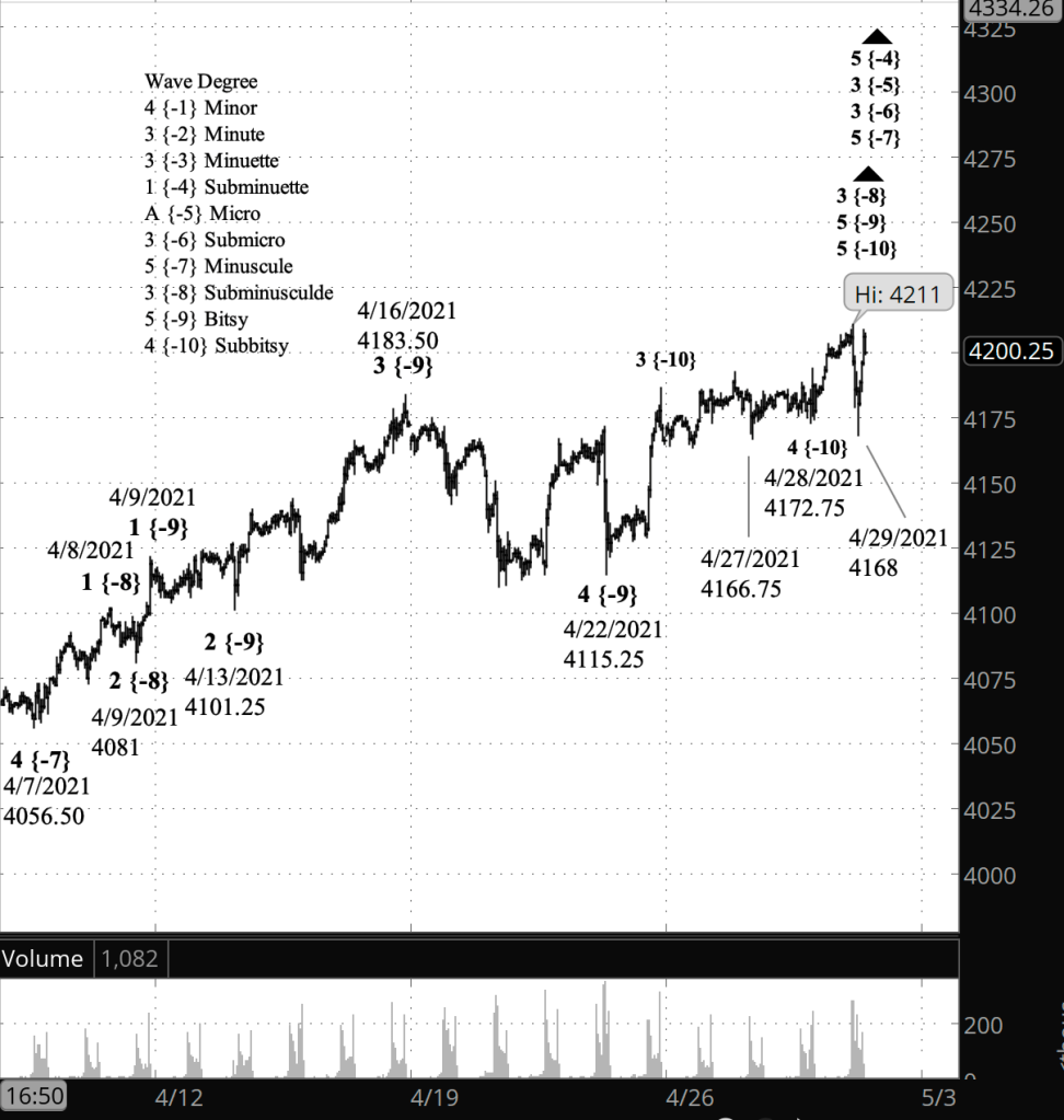 –April 27, low point of a sideways Subbitsy wave 4, at 4166.75.