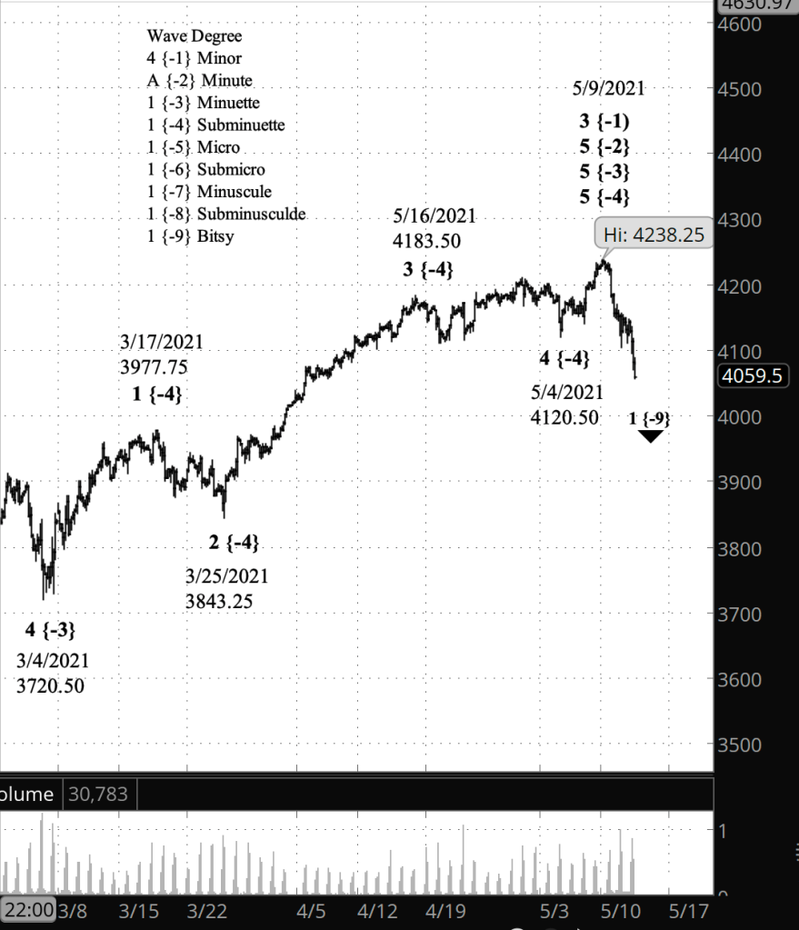 What does it mean? Yesterday’s analysis stands: The May 9 peak, 4238.25, ended the uptrend that began March 25 and kicked off a significant downward correction.
