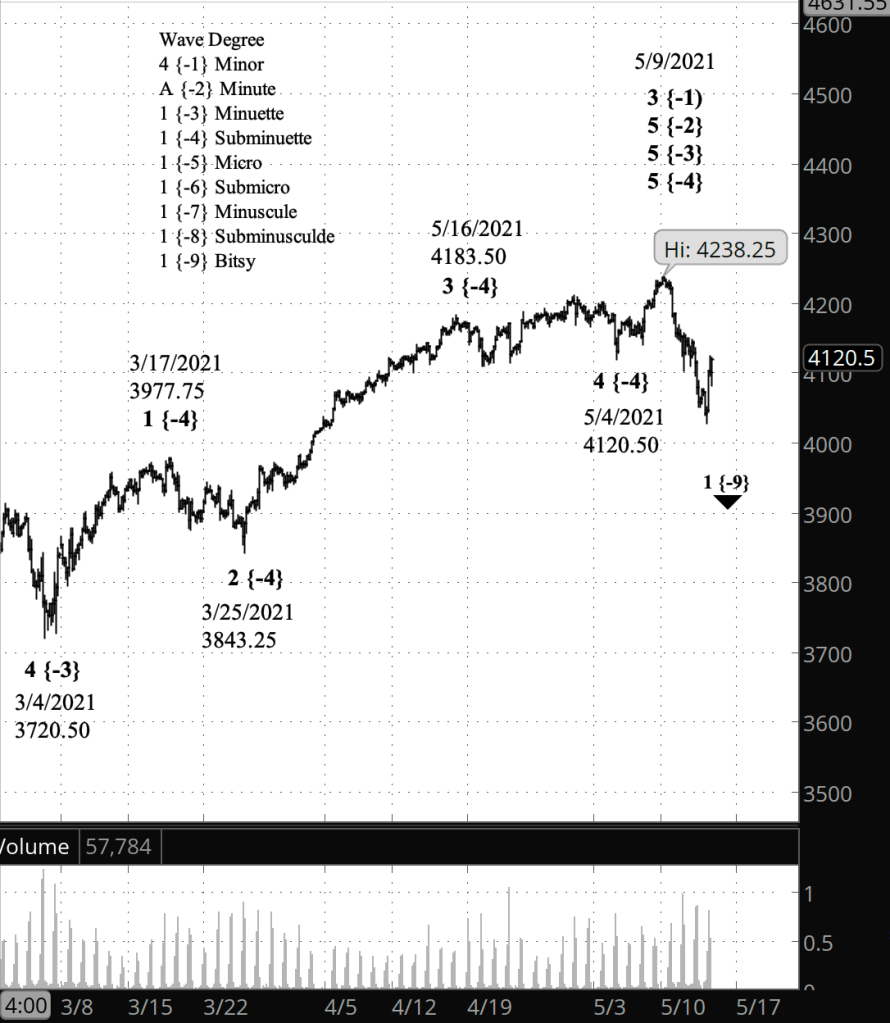 What’s the alternative? If the price reverses and moves above the May 9 high, then the rise that began March 4 from 3720.50 is still underway. By my alternate analysis, the main line of movement within the fluctuations would be net up.