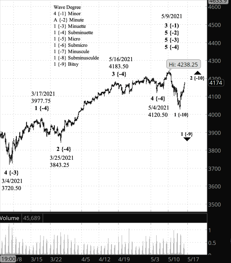 What does it mean? My principle analysis sees the bounce as an upward correction within a downtrend, both of small degree. The rise might well retrace most of the decline from the May 9 high of 4238.25. These small moves are happening within a far larger downtrend.