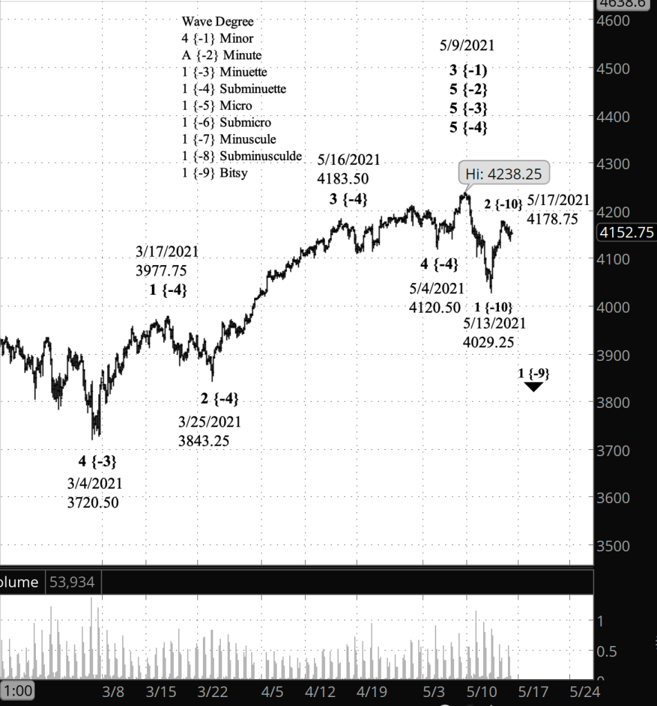 What does Elliott wave theory say? The correction is wave 2 of Subbitsy degree, an early small-degree portion of a larger correction to the downside that began on May 9 from 4238.25. Subbitsy 2 will be followed by a declining Subbitsy wave 3. Third waves tend to be quite energetic, so I’m looking for a bit of drama when that wave 3 kicks in.