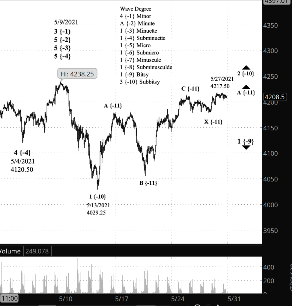 What’s the alternative? Unchanged from yesterday: If the price moves above 4238.25, the high of May 9, then the uptrend that began last year is still underway and higher prices lie ahead. If the price reverses and drops below 4029.25, the low of May 13, then the energetic middle portion of the downtrend that began May 9 is underway.