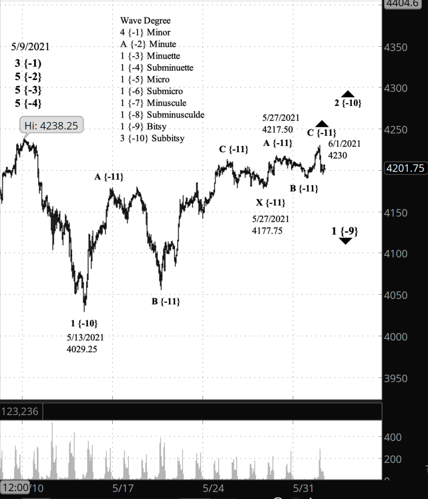 The morning peak is very close to the May 9 high of 4238.25, and as noted in this morning’s discussion, any move above that level changes the analysis of everything that has occurred since May 9. The count prior to the May 9 high suggests that level was the end of the uptrend, and if that is correct, there is very little room for a further rise.