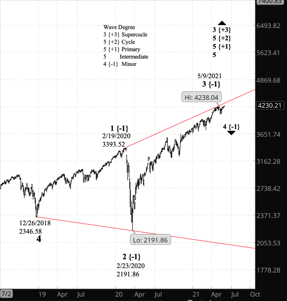 What does Elliott wave theory say? The May 9 peak of 4238.04 on the S&P 500 index ended a wave 3 rise of Minor degree that began on February 23, 2020 from 2191.86, the low point of the early pandemic crash. In my principle analysis I’ve labeled the ensuing decline as wave 1 of Bitsy degree, the first tiny step in a decline that will eventually move into the 2000s or lower, a 4th wave in an expanding Diagonal Triangle that began on December 26, 2018. The “expanding” part means that the price channel boundaries of the structure move further apart from each other, day by day.