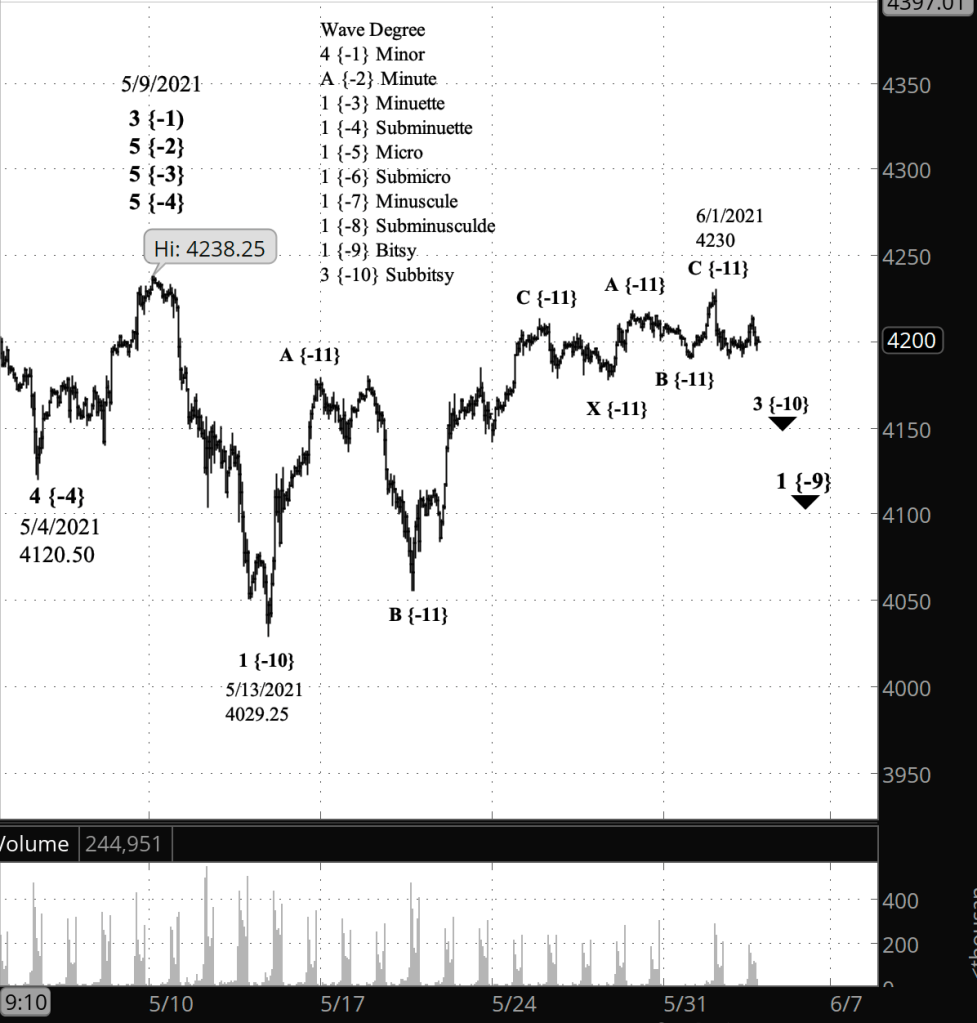 What does Elliott wave theory say? Under my principle analysis, the decline from yesterday’s high is wave 1 within wave 3 of Subitsy degree, which in turn is the middle wave within wave 1 of Bitsy degree. Bitsy wave 1 began on May 9.