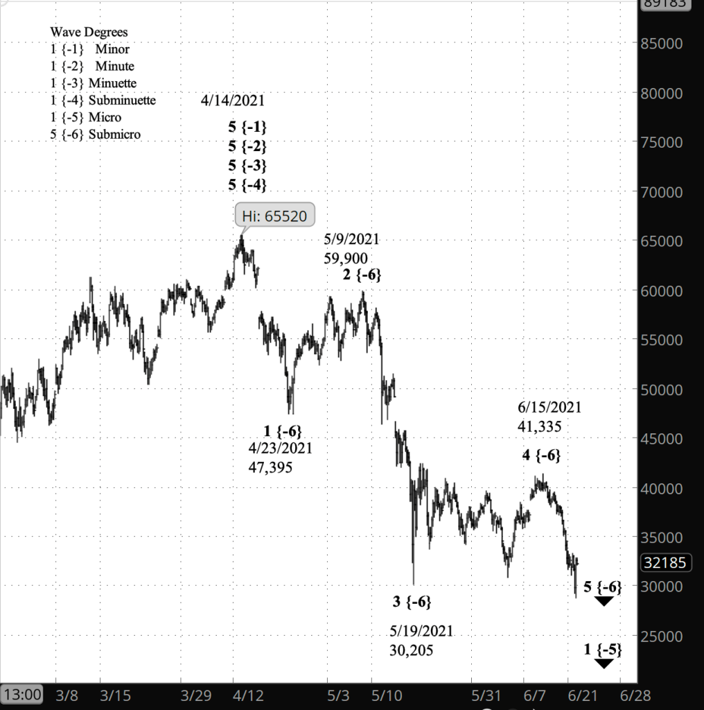 What does it mean? The decline is a final wave in a downtrend that began on April 14, when Bitcoin set a high of 65,520. It will be followed by an upward correction that will take back much of the decline since mid-April but will fall short of that all-time.
