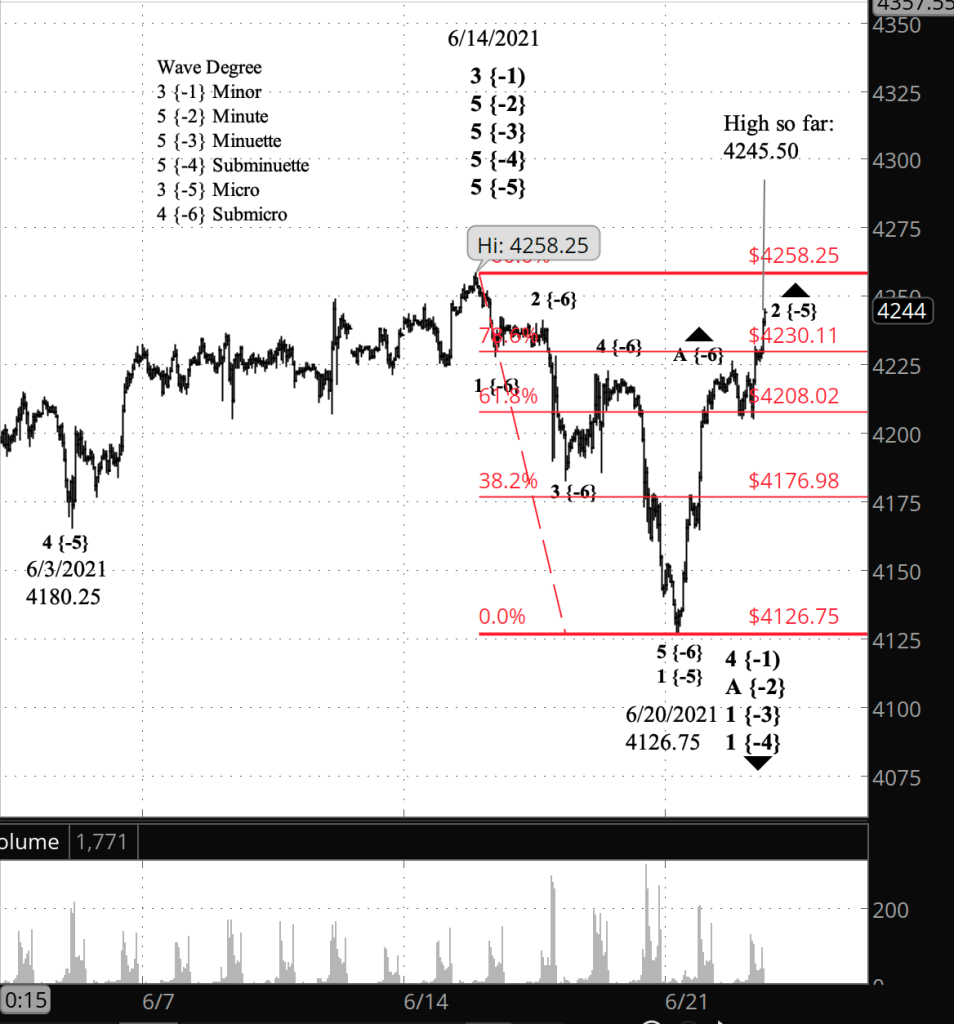 What’s the alternative? If the price rises above the June 14 peak, 4258.25, then the mid-June decline was a downward correction of an ongoing uptrend, the the subsequent rise — still underway — was either a resumption of the larger uptrend or a countertrend movement within the downward correction.