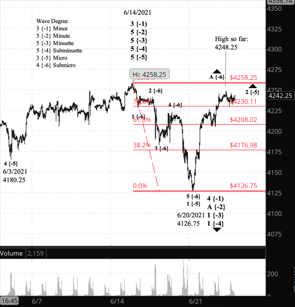 What does it mean? The overnight high is 10 points below the June 14 peak of 4258.25. By my principle analysis, the rise from June 20 is the middle portion of an upward correction that will be followed by a resumption of the larger downtrend, as long as the price remains at or below the June 14 peak.