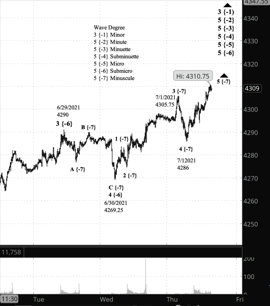 Half an hour before the closing bell. The S&P 500 continued to rise during the day, exceeding the high set before the opening bell, to a peak of 4310.75 on the futures (4319.96 on the index. Because of the rise to new high, I’ve changed my analysis to show the July 1 low of 4286 on the futures (4300.73 on the index) as the end of wave 4 of Minuscule degree, and the subsequent rise to a new high as wave 5 of Minuscule degree, which is still underway. Minuscule 5 is the final wave of Submicro degree, and its completion will also be the completion of five 5th waves of increasingly higher degree, to Minute wave 5, and up one, the completion of wave 3 of Minor degree.