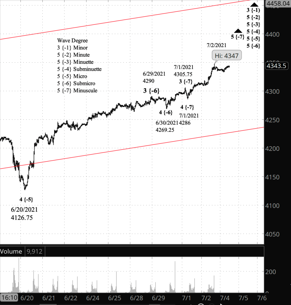 What’s happening now? The U.S. markets are closed in observance of the Independence Day. The S&P 500 E-mini futures are trading in an abbreviated global session, and overnight remained about 4 points below the high of 4347 attained Friday shortly before the closing bell.