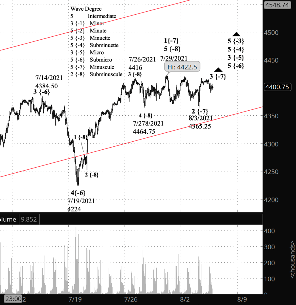 The July 29 high marking the end of wave 1 of Minuscule degree is clear, although it’s a very short 5th wave at the Subminuscule degree. Under the rules, I couldn’t count the July 29 high as part of a 4th wave correction because it moved above the end of the preceding 3rd wave.